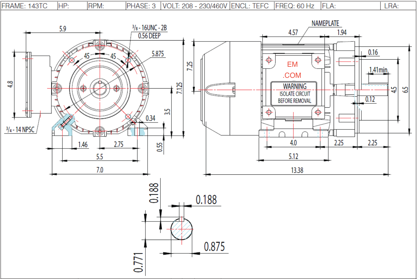 EM1-18-143TC Three Phase TC-frame Motor Dimensional Drawing